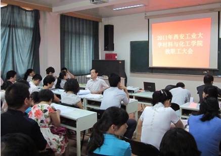 在院多媒体教室召开了全体教职工大会,会议由院工会主席夏峰主持,期间主要讨论了«学院津贴分配方案»及《学院实验室发展》工作报告,并高票通过了«学院津贴分配方案»。大会在齐唱国歌声中拉开序幕。
