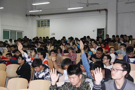 林老师首先从一个热门的微信小故事“教育不是让鱼爬树”说起,引出大学生需要明确“我是谁”、“我从哪里来”、“我将去何方”的讲座主题。通过对主题的详细解说,阐释了一个重要的启示:我们不能选择自己的出生,但可以决定自己的人生。随后,林老师在现场引导大家进行心理测试,让大家了解了各自的个性类型和生涯兴趣。然后,林老师通过分析心理情景剧,让大家认识到人生的幸福与成就来自于日常的生活态度与积极的创造力,明确了人生需要回忆过去、展望未来,但更重要的是把握现在。