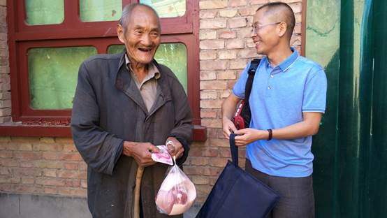 在黄窑村村委会会议室,扶贫小组成员同黄窑村村长对精准脱贫扶持工作展开深入讨论,随后在驻村干部的陪同下,走访了扶贫对象惠窑组田铁娃家。扶贫小组成员首先关切了解了田老夫妇身体状况、近期生活情况及农作物生长情况,之前为田家送去的3只羊羔已经长大,可以产奶已补贴家用。最后,扶贫小组为田老家送去了一吊肉及慰问金500元整。