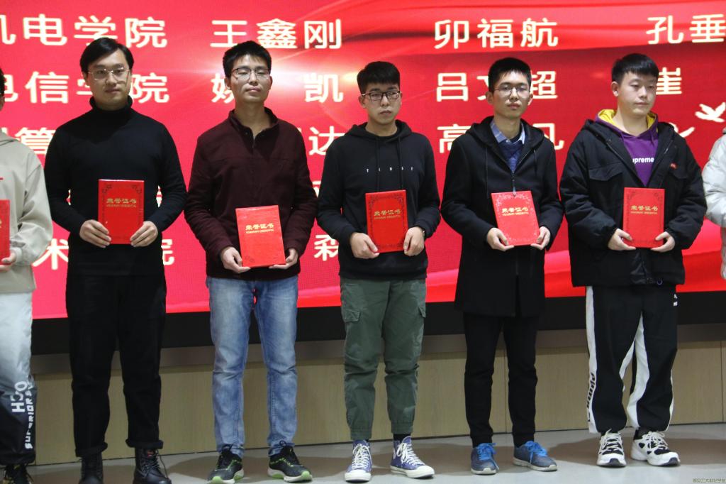 黄博,曹圳两名同学获奖。紧接着,参会嘉宾为获奖代表颁奖,国赛获奖项目指导教师国亮教授、第五届“科技之星”获奖代表蒋国亚同学发言。最后,校党委副书记吴介军发表讲话,再次对获奖同学表示衷心的祝贺,同时也希望同学们在即将到来的“探索杯”一展风采。至此,本次大会圆满结束。