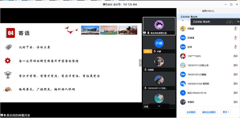 2020年4月18日,“薪火相传西工魂 奋力追梦材化人”优秀校友云报告会拉开帷幕,学院邀请已毕业多年的优秀校友与学院师生代表180余人齐聚云端,共叙情谊。优秀校友果志伟、王学东、郝运和姚智豪不仅向母院汇报了自己毕业后的发展成绩,同时也为材化学子们分享了自己的大学故事和成长感悟。此次优秀校友云报告会为材化学子和校友搭建了一个交流对话的平台,不仅加深了材化学子对专业发展的了解,也让材化学子们感受到了榜样的力量。