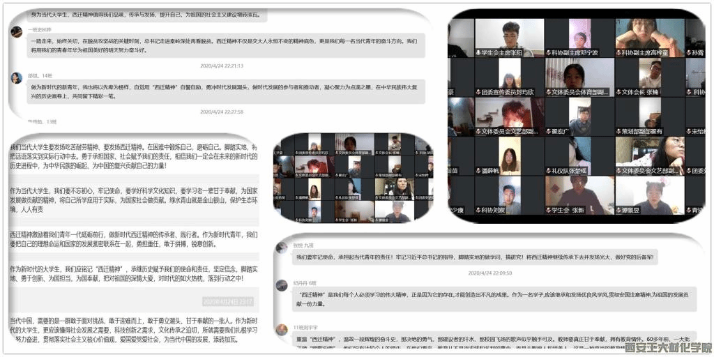 本次主题教育活动由团委副书记周耀东主持。会议开始,段老师带领大家在线上集体阅读和学习文件内容,深刻领悟习近平总书记重要讲话的重要含义,并重点引导团干部学习习近平总书记在交大考察调研中所指出的“西迁精神”,并指出广大青年要牢记总书记的讲话精神,作为团干部一定要坚定“四个自信”和树立“四个意识”,努力提升自我综合素质,在新时代为国家的各项发展做出贡献,做最美的新时代青年。根据学习内容部分团干部针对学习内容谈论自己的学习心得,从不同的角度、不同的方面交流习近平总书记在陕西调研时的重要讲话精神感悟,多数团干部深受鼓舞,立志将不忘初心,牢记自己身上的责任使命,并实践于自己在平时的学习和生活中去,坚定脚踏实地、一点一滴将“西迁精神”传承下去的共同信念。根据交流团委副书记周耀东谈论到:作为团学干部要认真领悟 “西迁精神”的格局与担当、实干与速度,用自己的行为和行动更好的去影响身边的青年人,做好“西迁精神”在新时代的传承者。