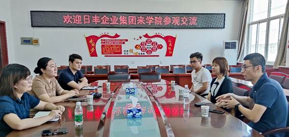 2020年8月13日上午,日丰企业集团人力资源部总监闫启超、招聘经理潘敏红、陕西大区销售经理王毅一行三人来材化学院走访调研,洽谈校园招聘事宜。学院党委副书记张艳霞、辅导员段强、刘强珺出席会议。