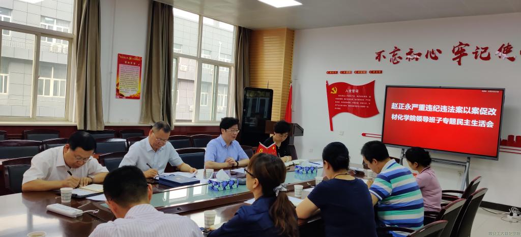 2020年9月14日,材化学院于工3-410召开赵正永违纪违法案以案促改领导班子专题民主生活会,校党委书记刘卫国、党委组织部长梁闪慧出席会议,会议由材化学院党委书记呼晓青主持。