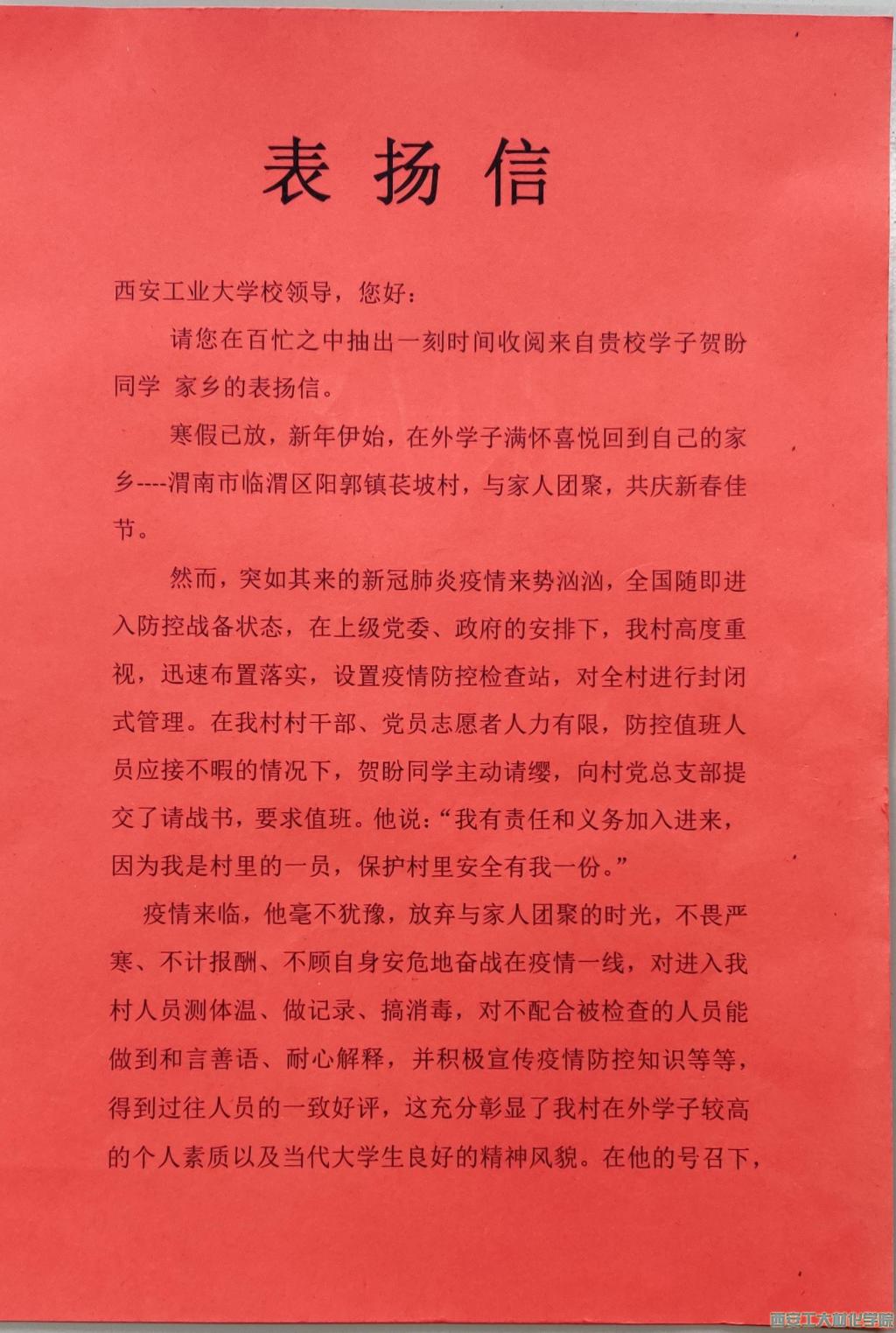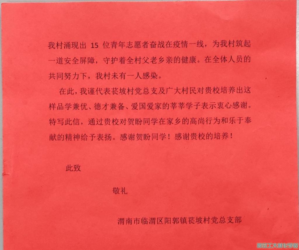 收到了来自渭南市临渭区阳郭镇医坡村的疫情表扬信,信中对材化学院2018级材料化学专业贺盼同学在疫情期间,为当地疫情防控工作贡献青春力量提出了感谢和表扬,并对91猫先生
