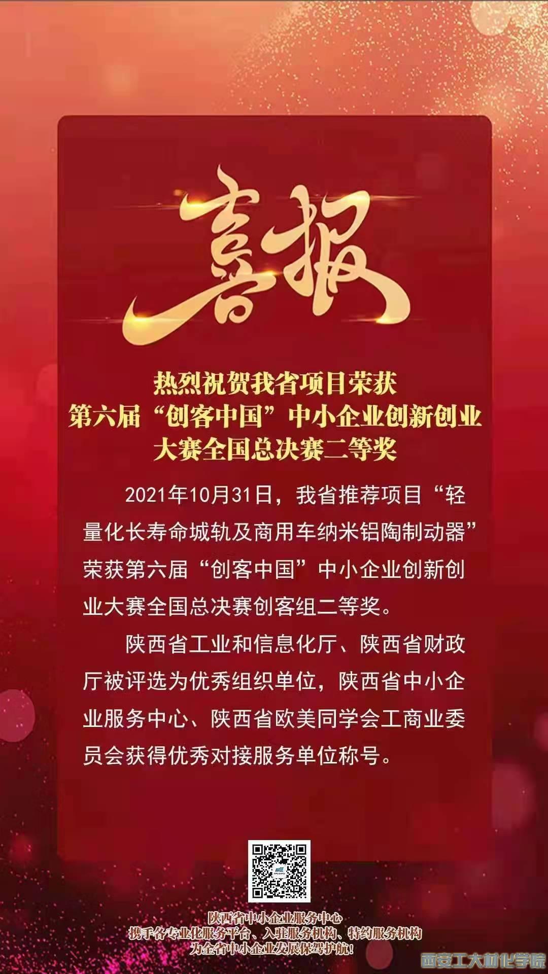 2021年11月1日,工业和信息化部举办了第六届“创客中国”中小企业创新创业大赛全国50强决赛,材化学院吕煜坤副教授团队的“轻量化长寿命城轨及商用车纳米铝陶制动器项目”成为陕西省入围全国大赛50强的唯一参赛项目,最终获得第六届“创客中国”中小企业创新创业大赛全国总决赛二等奖的优异成绩。