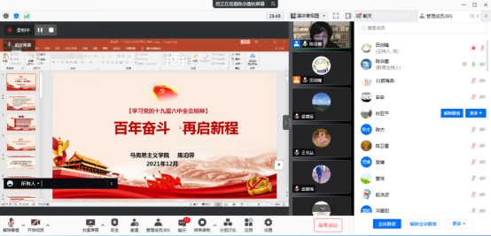 学习贯彻党的十九届六中全会精神宣讲工作方案》及《党的十九届六中全会精神学习宣传方案》文件要求,材化学院党委邀请校思政课标兵、宣讲团成员陈泊蓉老师为全体教师做题为《百年奋斗,再启新程》的专题宣讲。80余名教师参加了本次线上会议,会议由学院党委书记呼晓青主持。