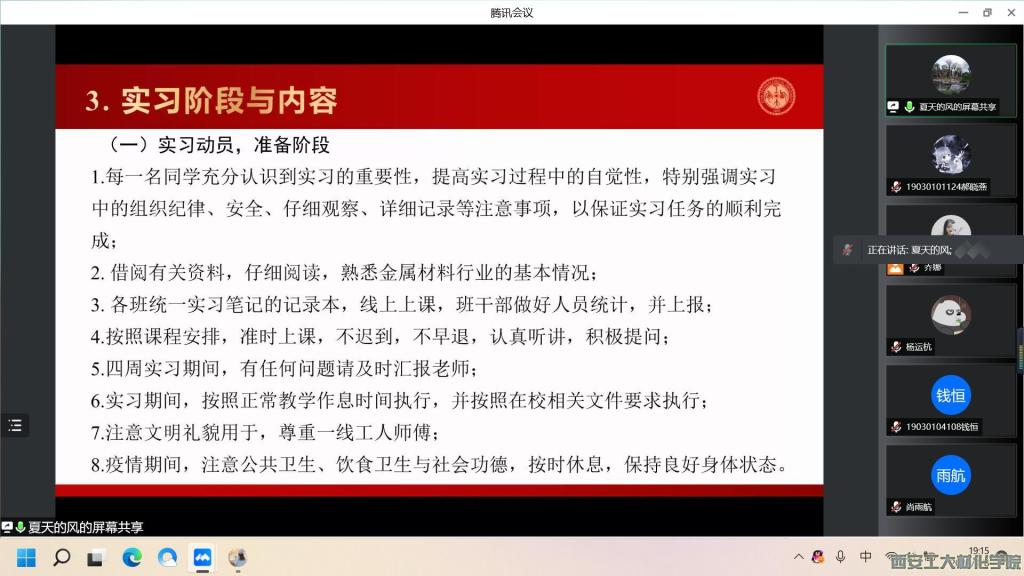 2022年4月8日晚,材化学院通过线上会议的形式举办了2019级金属材料工程专业生产实习动员大会,本次动员大会主要对实习要求以及实习形式做了说明,材化学院教师刘志学、马志军、夏峰和乔娜出席会议,2019级金属材料工程专业全体同学参加会议。