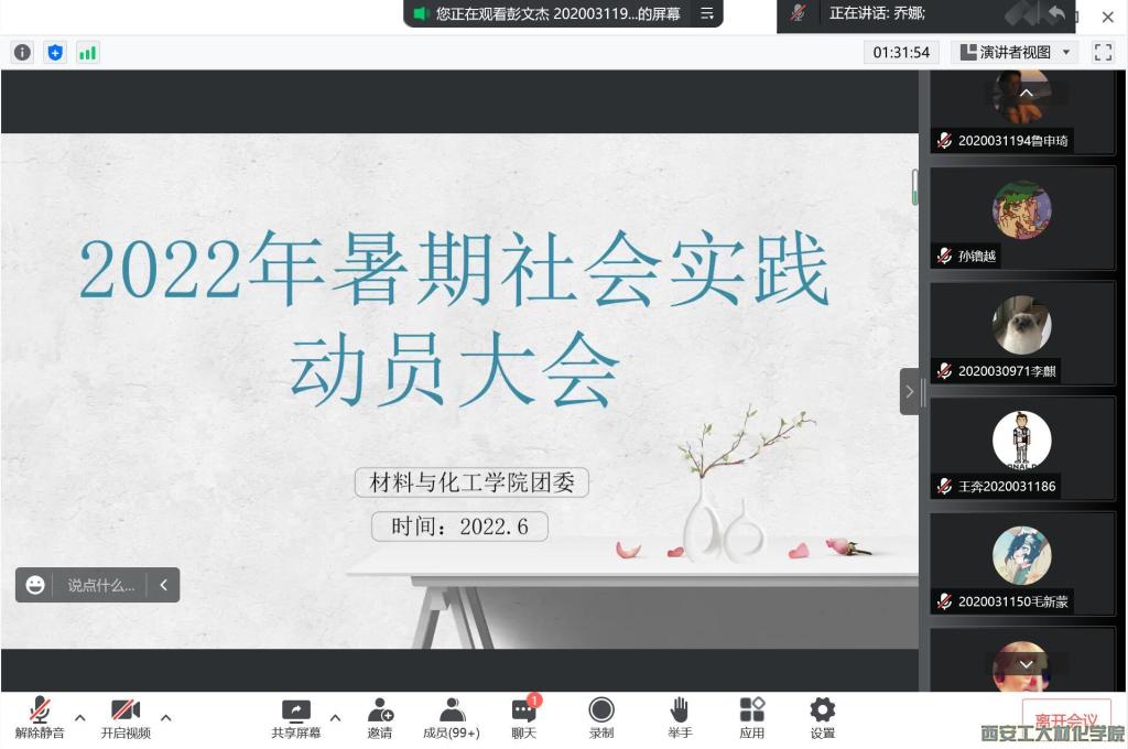为引导和帮助广大青年学生上好与现实相结合的“大思政课”,在社会课堂中“受教育、长才干、作贡献”,以实际行动迎接党的二十大胜利召开,材化学院团委于2022年6月16日晚在腾讯会议举行2022年暑期社会实践动员大会。学院团委书记段强、2020级辅导员徐慧子、2019级部分学生及2020级全体学生参加次会议,团委副书记乔娜主持会议。