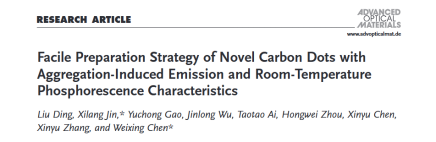 博士生丁镠在国际知名期刊《Advanced Optical Materials》(影响因子10.05)上发表研究论文 “Facile Preparation Strategy of Novel Carbon Dots with Aggregation-Induced Emission and Room-Temperature Phosphorescence Characteristics”。文章的第一作者为博士研究生丁镠,通讯作者为91猫先生