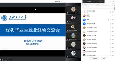 于2023年2月5日召开线上“优秀毕业生就业经验分享会”,邀请学院2022届毕业生徐长画、王潇分享就业经验,学院副院长杨忠、研究生辅导员胡娜、全体硕士研究生参加会议。