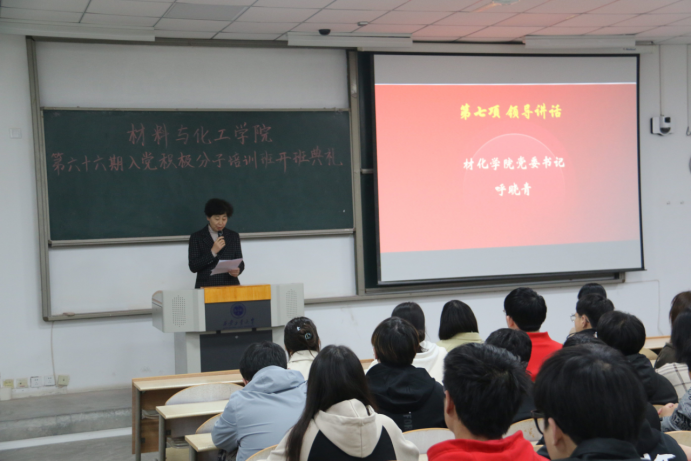 为深入学习贯彻习近平新时代中国特色社会主义思想,加强对入党积极分子的培训工作,根据校党委工作安排和党校工作要求,按照《中国共产党普通高等学校基层组织工作条例》《中国共产党党员教育管理工作条例》等文件要求,材化学院党委于2023年4月4日下午18:30在教1-103举行入第六十六期党积极分子培训班开班仪式暨第一次授课。