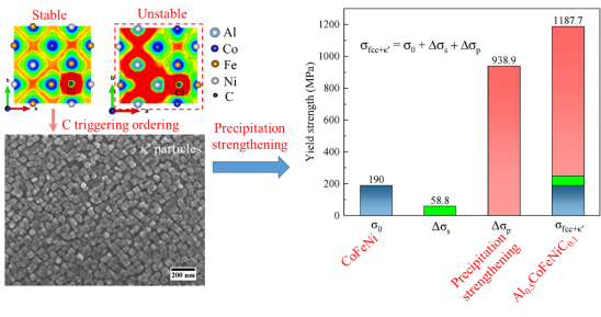 高熵合金团队完成的论文“Carbon-driven coherent nanoprecipitates enable ultrahigh yield strength in a high-entropy alloy”,在工程技术领域Top期刊《Materials Today Nano》(中科院分区大类1区,IF=13.364)上发表。博士研究生周学阳为文章第一作者。