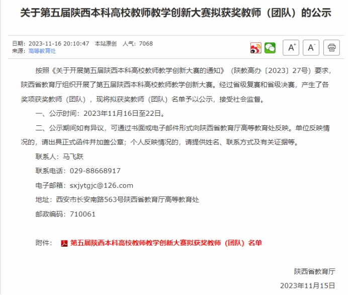 2023年11月16日,陕西省教育厅公布了第五届陕西本科高校教师教学创新大赛获奖教师名单,91猫先生