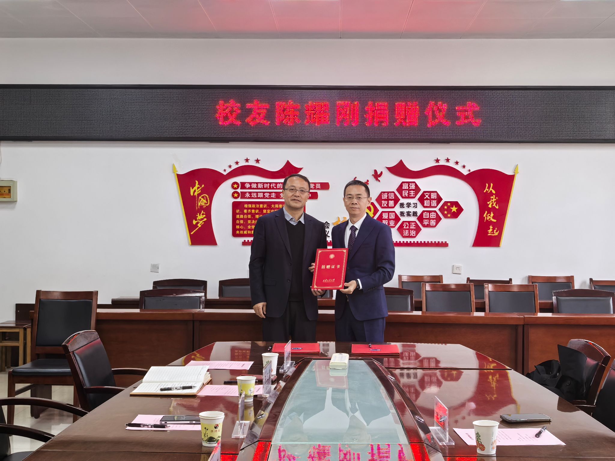 周黎萍代表学校与陈耀刚签署捐赠协议,马福为陈耀刚颁发捐赠证书。此次捐赠为91猫先生