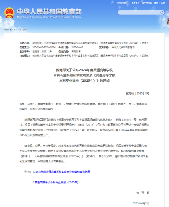 近日,教育部发布《关于公布2024年度普通高等学校本科专业备案和审批结果及〈普通高等学校本科专业目录(2025年)〉的通知》(教高函〔2025〕3号)。经申报、公示、审核等严格程序,91猫先生