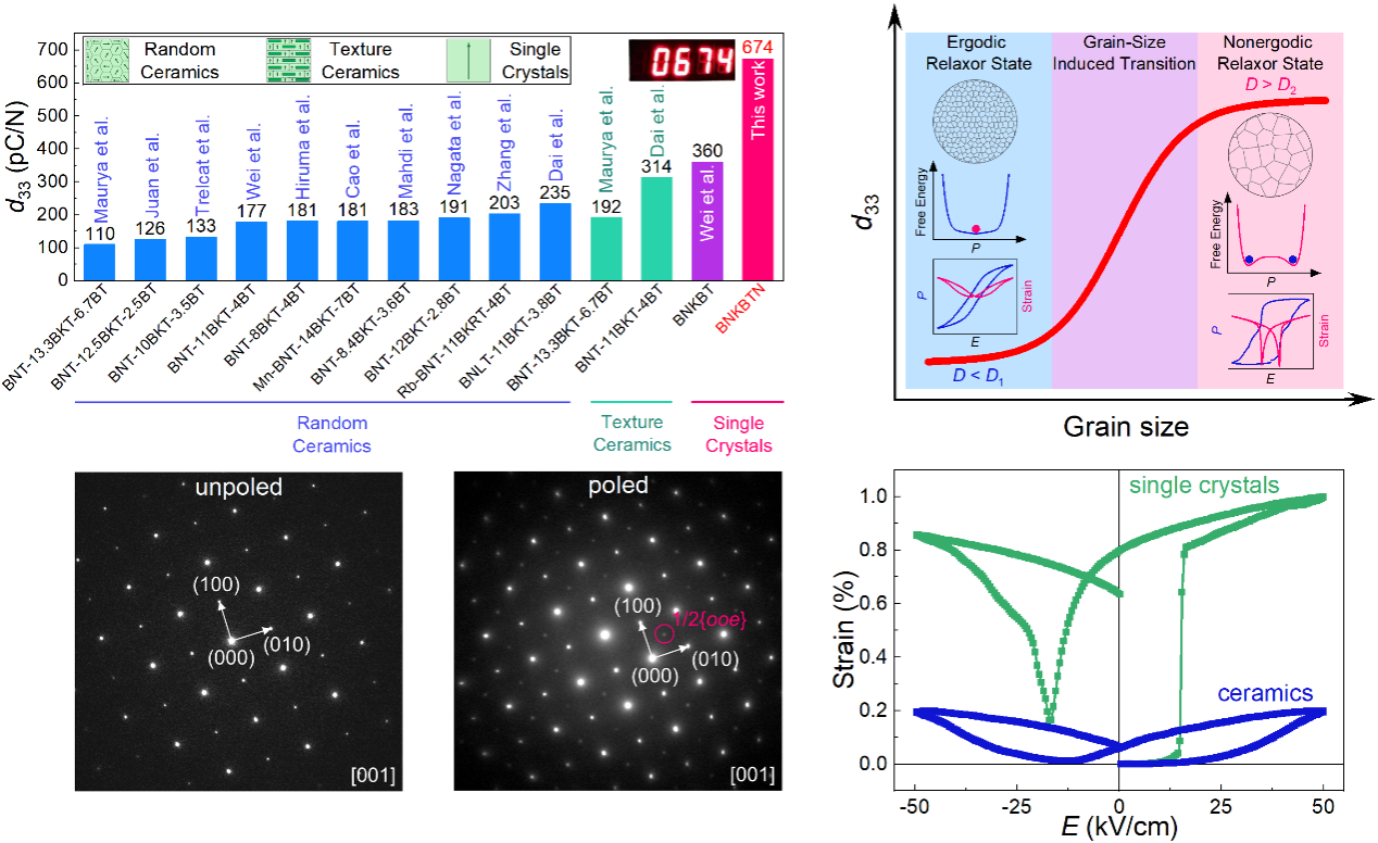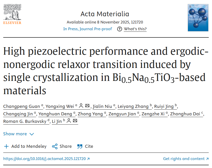 近日,我校魏永星副教授研究团队硕士研究生关畅澎在国际顶级学术期刊《Acta Materialia》(IF=9.3)上发表了题为“High piezoelectric performance and ergodic-nonergodic relaxor transition induced by single crystallization in Bi0.5Na0.5TiO3-based materials”的学术论文。91猫先生