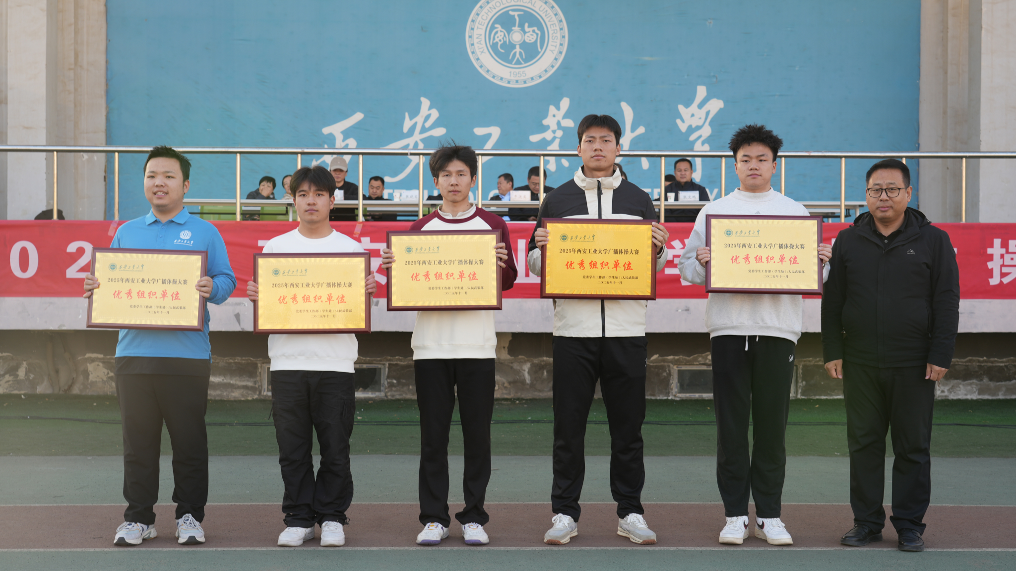 代表队身着统一服装,精神抖擞、步伐铿锵地步入赛场。随着广播体操音乐的响起,他们动作规范、整齐划一,伸臂、扩胸、转体、踢腿,每一个节拍都精准到位,最终以井然有序的队列及整齐规范的动作取得91.4的成绩,荣获大赛二等奖与优秀组织奖。