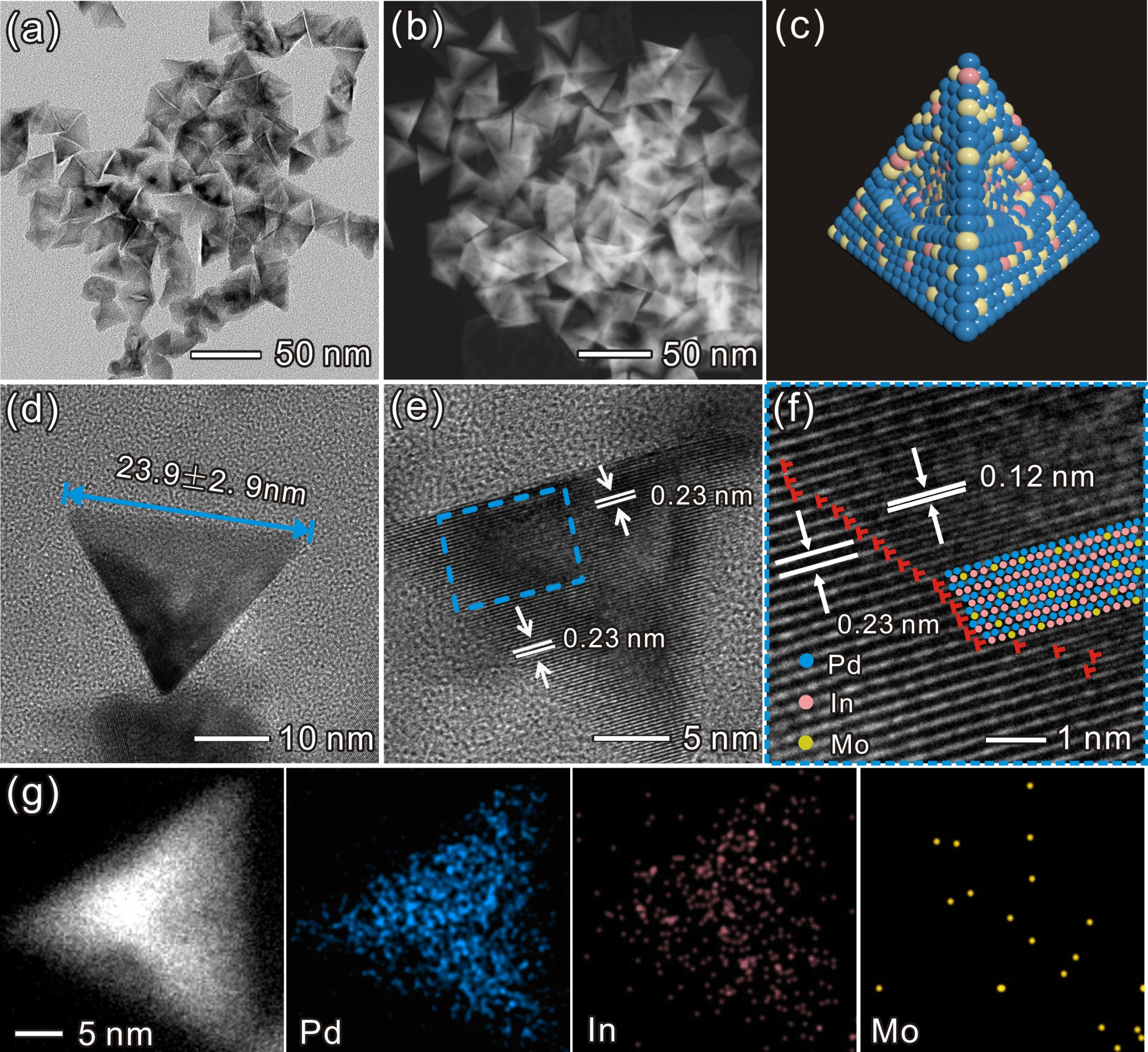 本研究采用简单的一锅反应法制备了凹面四面体结构的多相钯铟钼纳米催化剂。通过简单控制前驱体的浓度,获得了不同组成的多相四面体钯铟钼纳米催化剂。这些多相四面体钯铟钼纳米催化剂由面心立方结构和金属间结构组成。多相四面体钯铟钼纳米催化剂在小分子醇的电催化氧化方面表现出显著提升的性能。这些性能的增强主要来源于铟和钼原子的氧亲和性、内部多相结构的界面缺陷和金属间结构,在其共同作用下优化醇分子在其表面的吸脱附能,提升转换效率。这种在钯基合金中构筑多相界面,从而优化催化效率的方式,为高效燃料电池催化剂的设计提供了一定的参考价值。