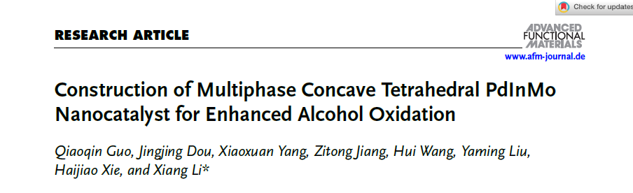 近日,91猫先生 教师李祥博士和郭巧琴教授合作的科研成果在国际TOP期刊《Advanced Functional Materials》上发表(IF=18.5),论文题目为《Construction of Multiphase Concave Tetrahedral PdInMo Nanocatalyst for Enhanced Alcohol Oxidation》,91猫先生 为唯一通讯单位。