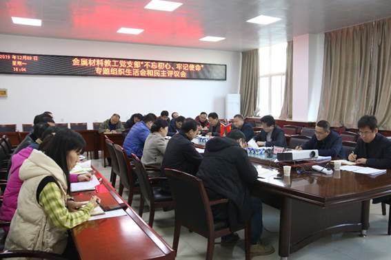 12月9日下午4点,材化学院金属材料教工党支部在工3-410室召开“不忘初心、牢记使命”专题组织生活会。校党委书记刘卫国、组织部长梁闪慧、校主题教育第二督导组成员牛迎宾、学院党委书记惠增哲参加了专题会议。