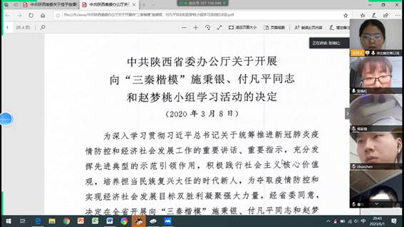 会议伊始,张瑞红老师带领大家依次学习了“习近平总书记来陕考察讲话重要讲话”、“中共陕西省委关于授予施秉银、张怡、雷根平同志和追授乔锦仁同志“全省优秀共产党员”称号的决定”、“中共陕西省委办公厅关于开展向“三秦楷模 ” 施秉银、 付凡平同志和赵梦桃小组学习活动的决定”重要文件,张瑞红老师指出,支部每位党员都应向优秀党员学习,严格要求自己,要争做一名有担当、有责任、将来对国家、对社会和对人民有用的人。接着,支部成员张校源、杨家嵩、沈伟对会议学习的内容交流了心得体会,中国共产党的统一领导,在疫情期间每个中国人民都更加感受到中国特色社会主义道路自信、理论自信、制度自信和文化自信。党员同志冲锋在前,牺牲个人利益,为国家、社会作出贡献,始终将人民的利益放在第一位,我们应该向他们学习。