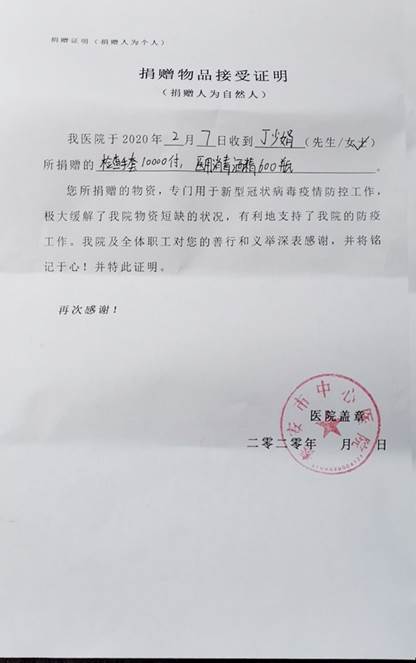泰安市中心医院对贝胜男家人的善行和义举深表感谢并向贝胜男妈妈发放了捐赠证明。
