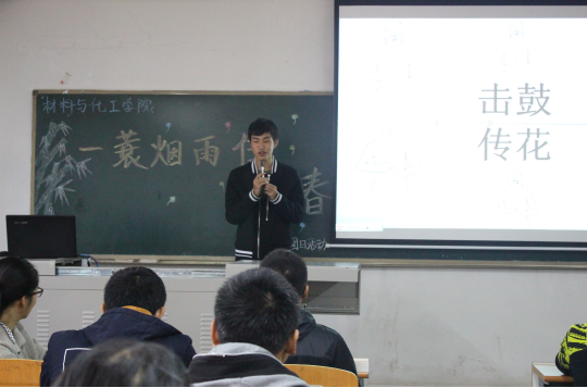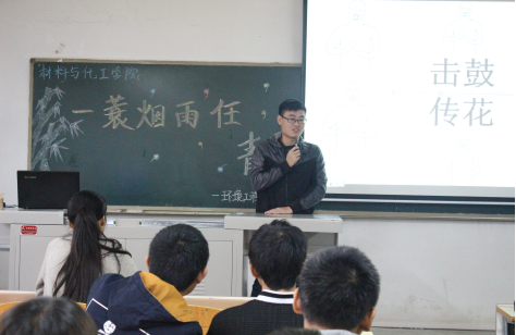 活动开始,首先由团支部书记贾利萍主持本次活动,用一段视频为各位同学引入“青春”的概念,揭示了本次活动的主题“我的青春故事。接着,在组织委员左钰荻的组织下,受班委们邀请的分团委干部与团员们共同进行了一场趣味横生的小游戏——心有灵犀。从ppt上依次弹出的团员们日常生活中常见的行为举止的词语,逐渐引出团员们对自己青春往事的回想。最后在一段节奏强烈的击鼓传花音乐游戏中,多数团员上台讲述了自己的青春趣事。