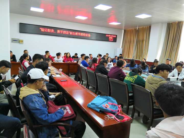 2018109日中午12:10在工3-410会议室召开2018级新生班干部第二次培训会议,会议由辅导员张瑞红主持,各班班长、团支书、学习委员和舍长参加了此次培训。
