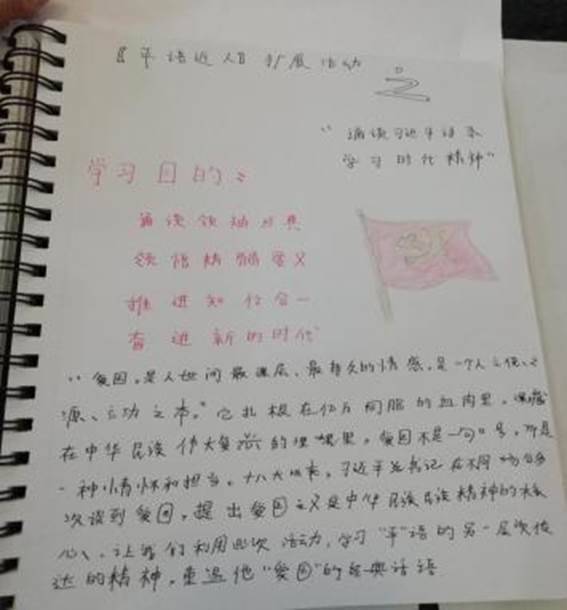 “爱国,是人世间最深层、最持久的情感,是一个人立德之源、立功之本。”它扎根在亿万同胞的血肉里,深藏在中华民族伟大复兴的理想里,爱国不是一句口号,而是一种情怀和担当。材化学院学生第二党支支部全体党员和团支部的部分成员通过深情诵读了习近平总书记爱国经典语录,让爱国主义成为每一个青年的坚定信念和精神依靠。朗读会结束后支部又精心制作了“习近平总书记爱国经典语录”学习活动的感悟手册,纪录了支部对这次活动对爱国主义的情怀。