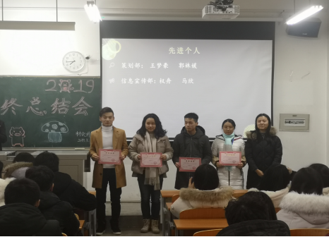 本次会议由策划部部长乔国权主持。首先由组织的各个部长对本学期的工作进行总结,并对部员们的工作给予了充分的肯定,鼓励部员们需不忘初心,继续努力。接着举行颁奖典礼,主持人宣布获得优秀先进个人和优秀部长的人员名单,分别由副主席白露茜,党林林,主席南亚新为获奖干事与部长进行颁奖并合影留念。接着由获得先进个人代表马欣上台分享自己的感悟,表示在工作中要敢于尝试,这个过程虽然艰苦但受益良多。之后,通过视频与PPT带大家回顾了2018年的工作,一起见证了萌新们和部长们的成长。最后,学生干部南亚新、党林林发言总结了这学期工作中所取得的工作成果以及工作中的不足之处,鼓励大家在下学期积极参加校级乃至国家级的活动,从而达到锻炼自己的目的。至此,本次会议圆满结束。