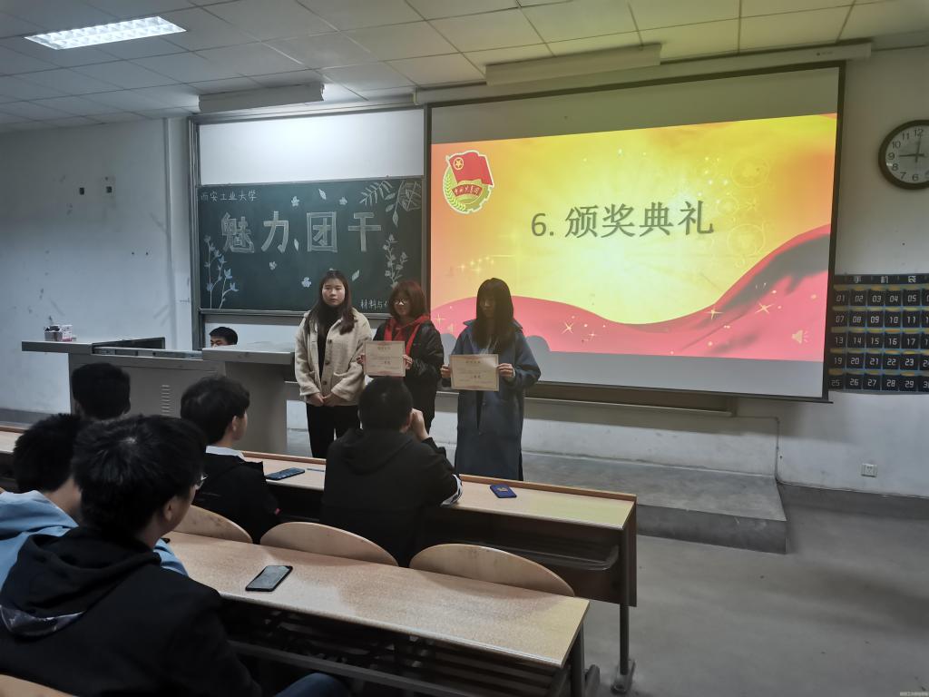 2019级学生王若贤荣获本次比赛第一名,刘宇宇,崔卓阳同学获得第二名,张悦,李悦,赵倩倩同学获得第三名,同时邀请评委为获奖的团干颁发证书并合影留念。至此,本次活动圆满结束。