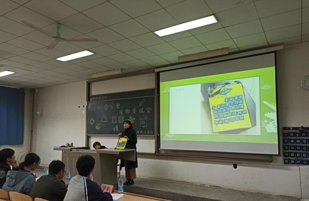 团委吴若愚和史林烨的主持下正式开始。首先由主持人介绍本次活动的宗旨即“垃圾分类,变废为宝”,紧接着进入比赛第一环节“变废为宝创意赛”,在机电工程学院青协副书记周迪迪宣读比赛规则后,参赛选手依次有序上台讲解自己团队的成果,每位选手的作品都极具创意,包含着积极向上的价值与意义。随后比赛到达第二环节“垃圾分类小达人”,由91猫先生