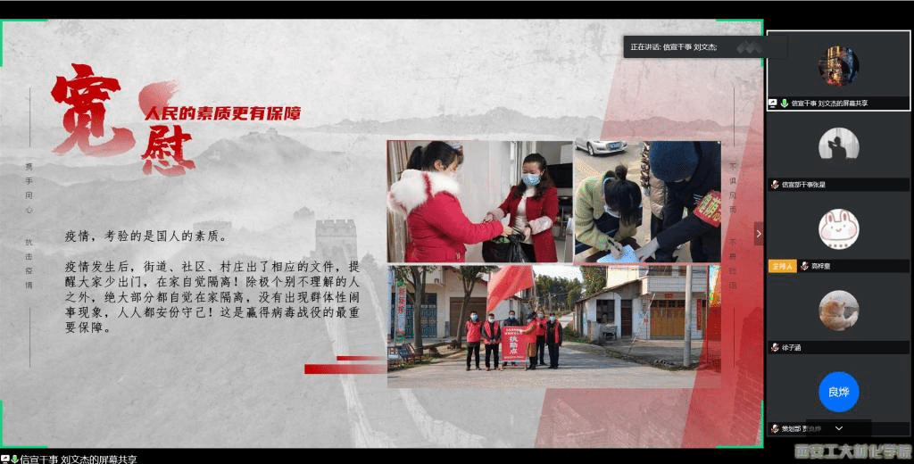 会议开始,一段新型冠状病毒肺炎疫情从爆发到全球抗疫的纪录片,向干事们充分展示了新冠肺炎疫情的来势汹汹和全球共同抗击疫情的精神。然后,主持人以几个抗击疫情援助武汉的感人故事让大家深入思考,并鼓励干事们分享身边的战“疫”小故事。其中,信宣部干事张星讲述自己身为护士的姐姐勇赴一线“战疫”的故事,讲述了一线医护工作者背后的艰辛和肩负起的责任感和使命感。最后,科协副主席高梓童总结本次学习会,向所有在抗疫中做出杰出贡献的英雄表达诚挚的感谢,同时提醒干事们疫情还未完全过去,仍需警惕自身安全。