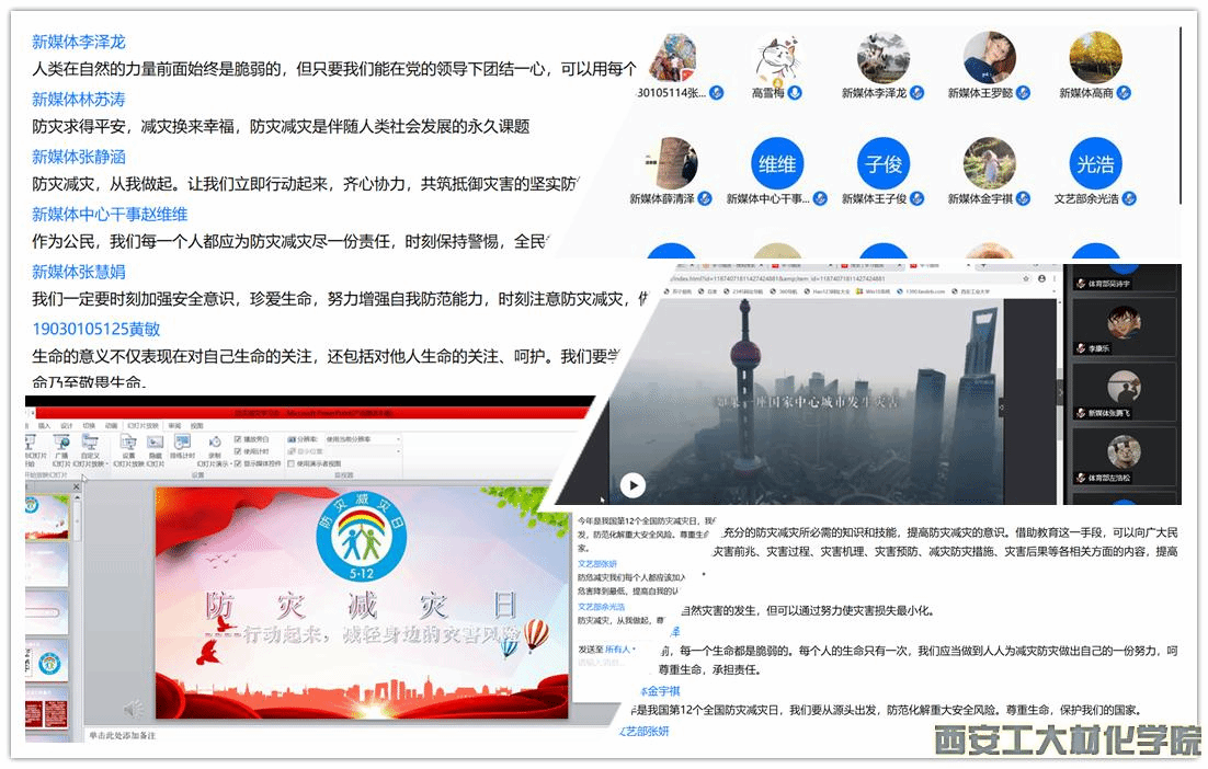 本次会议由学生干部高雪梅主持。会议伊始,高雪梅对5月12日防灾减灾日进行介绍,让同学们了解防灾减灾的必要性,有利于进一步唤起社会各界对防灾减灾工作的高度关注,增强社会防灾减灾意识,普及推广全民防灾减灾知识和避灾自救技能,提高各级综合减灾能力,最大限度地减轻自然灾害的损失。随后,高雪梅借助视频对目前全球发生频繁的地震和火灾灾害进行详细的介绍,并普及遇到此类灾害时的自我营救及自我保护措施。最后,学生干部张阳告诫各部门成员在家期间尽量减少外出,做好防护,使成员们意识到在家学习出现的问题以及疫情尚未离开的现状。至此,此次学习会圆满结束。