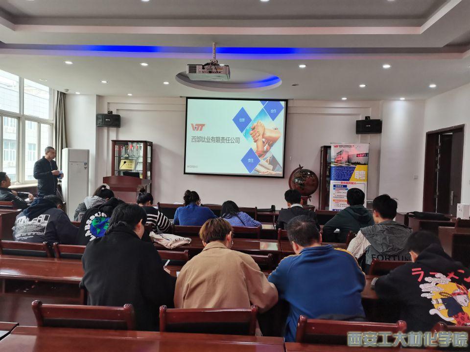 金属材料工程专业同学介绍公司情况,主要鹆钛、锆及其合金加工材生产的大开型国有高新技术企业,是西北有色金属研究院的产业实体,是上市公司西部材料的控股子公司。相关工作人员为同学们详细讲解了钛合金的制造生产以及相关先进的核心生产机器,同时为同学们介绍了西部钛业的薪资、福利和待遇以及未来的晋升路线。