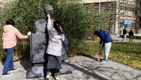 20211121日中午,学生第四党支部组织党员前往图书馆一侧擦拭吴运铎先生雕像,并向雕像致敬。