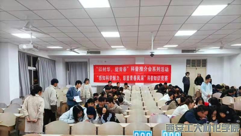 学生会主办,分为科普知识讲座、科普知识竞赛、你画我猜与军事模型制作四个部分。11月22日重点开展项目:科普知识讲座与科普知识竞赛。该两项目既丰富了学生的科普知识储备,又锻炼了学生对科学思维的培养。科普讲座秩序有条,受邀教师陈山川老师句句经典,引人入胜。科普知识竞赛各队伍迎难而上,积极解决难题。11月25日与11月26日则分别开展你画我猜与军事模型制作项目。整个比赛现场热烈,氛围活泼,你画我猜的队伍配合默契,眼疾手快。军事模型制作中的作品生动形象高度还原。最终共有42名同学获得“科普之星”荣誉称号,14组获得“科普先进小组称号”。
