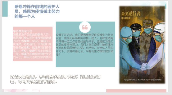 随后,刘文静引导学生认真上好线上课程,并利用非常时期的空闲时间加强自我提高和自我管理,合理规划学习生活,找到适合自己的学习方式,能使自己更好地投身于学习中。她还针对性地开展感恩教育,引导同学们在感恩中成长起来,努力做一个传播爱、奉献爱、充满爱的人。“为众人抱薪者,不可使其冻毙于风雪;为自由开道者,不可令其困厄于荆棘。”学会感恩,才能学会做更好的人。其后展开了新的讨论“面对此次身边的疫情,你最大的感触是什么?”刘霞同学分享了自己在疫情期间接收到了身边的各种令她感动的瞬间,体现了在疫情面前人情的温暖与可贵。