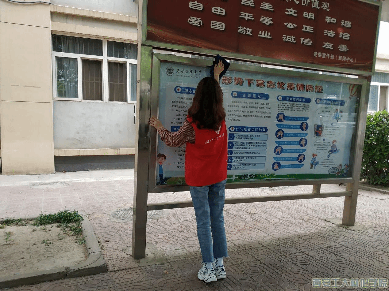 活动开始,志愿服务小组统一着装并自行组为四队,于12公寓楼下的橱窗栏处集合并开展活动,每队负责一个校园橱窗,每一位志愿小组成员自带抹布或湿巾。活动过程中,志愿者们认真地擦拭每一扇橱窗,保证橱窗干净明亮,让橱窗所展示给同学的内容清晰可见,使其成为校园里的一抹靓丽的风景线,也为学校的各方面宣讲添砖加瓦。同时,学生党员志愿者对橱窗周围的垃圾和杂物也进行了处理,保证周围的一草一木都干净如新,带给师生一个更加舒适的环境。经过志愿者的共同努力,学校的橱窗以及周围环境焕然一新。