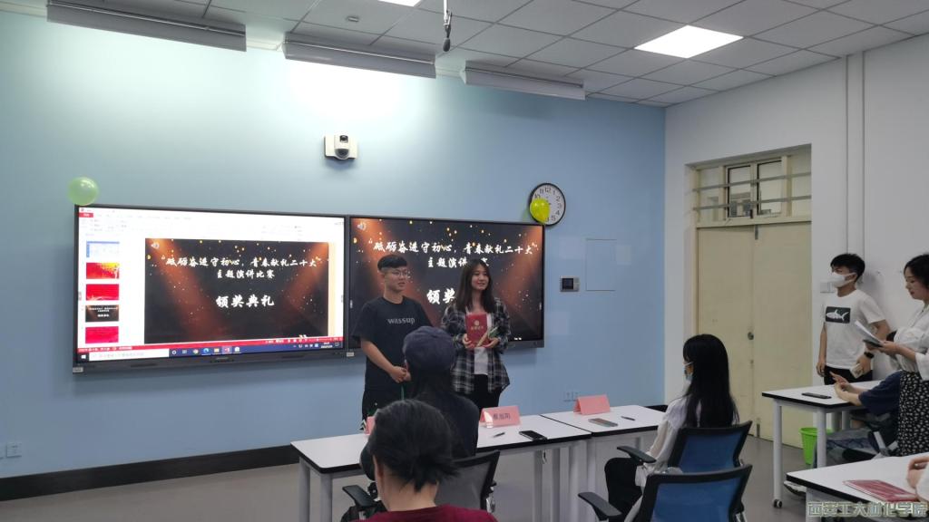 本次比赛分为初赛和决赛两部分。初赛中,选手以党员事迹为出发点,提交1-2分钟的演讲视频参与评选。经过评委打分后,最终有八名同学脱颖而出进入决赛。决赛阶段,选手通过PPT、视频等形式展示自身作为新时代青年应该承担的职责和使命,并对国家迈入新时代新征程表达自己的热爱,选手慷慨激昂的语调、激情饱满的情绪感染着在场的每一位观众,现场高潮迭起、掌声不断。评委们根据选手表现进行公平公正的打分,最终决出一等奖一名、二等奖二名、三等奖三名。
