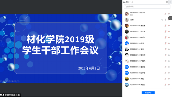 顺利开展学生工作,维护校园安全稳定,提高学生干部工作能力与责任意识,材化学院2019级2022年6月2日中午通过腾讯会议召开了2019级学生干部工作会议。2019级学生辅导员乔娜主持会议,2019级全体学生干部