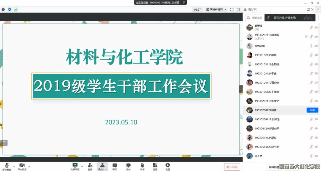 为深入开展学习贯彻习近平新时代中国特色社会主义思想主题教育,切实推进毕业生起航教育,5月10日晚7时,材化学院2019级于腾讯会议召开学生干部会议,会议由2019级辅导员乔娜主持召开,2019级全体班长、团支书参加会议。
