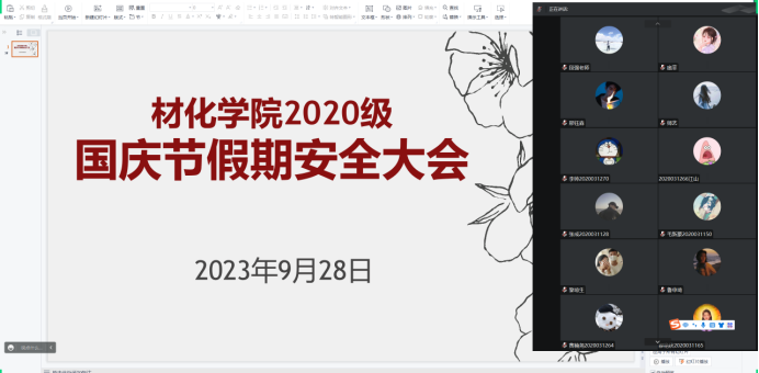 又是中秋见明月, 恰逢国庆添祝福,为扎实做好假期学生安全教育工作,确保校园安全稳定。9月28日下午,2020级国庆节假期安全教育大会于腾讯会议召开,全体学生参加。会议由辅导员段强主持。