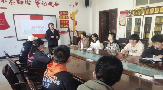 活动开始,由辅导员老师张瑞红向全体同学进行爱国主义思想教育工作,她指出:爱国主义是推动中国社会前进的巨大力量,作为新时代的新青年,应当脚踏实地提升自己的专业素养,有一颗诚挚的报国心。接下来,由郑梦瑶等同学进行了国学经典诵读与解说,全体同学更加深入地学习了《破阵子》、《江城子》、《少年中国说》等经典诗歌。活动最后,由班长李海涛同学进行总结发言,鼓励同学们积极学习爱国经典诗词,坚定文化自信。