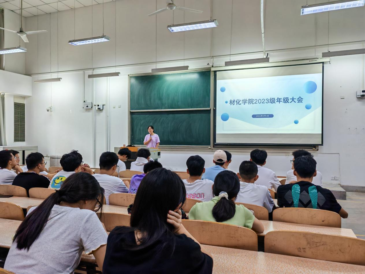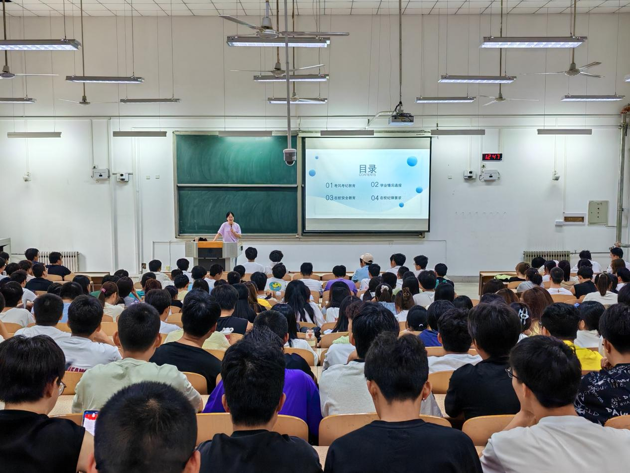 2023级于教1-205召开新学期年级大会,全体2023级学生参加会议,2023级学生辅导员乔娜主持会议。会议回顾总结了上一学年的学生工作情况,并安排部署了新学期学生工作。