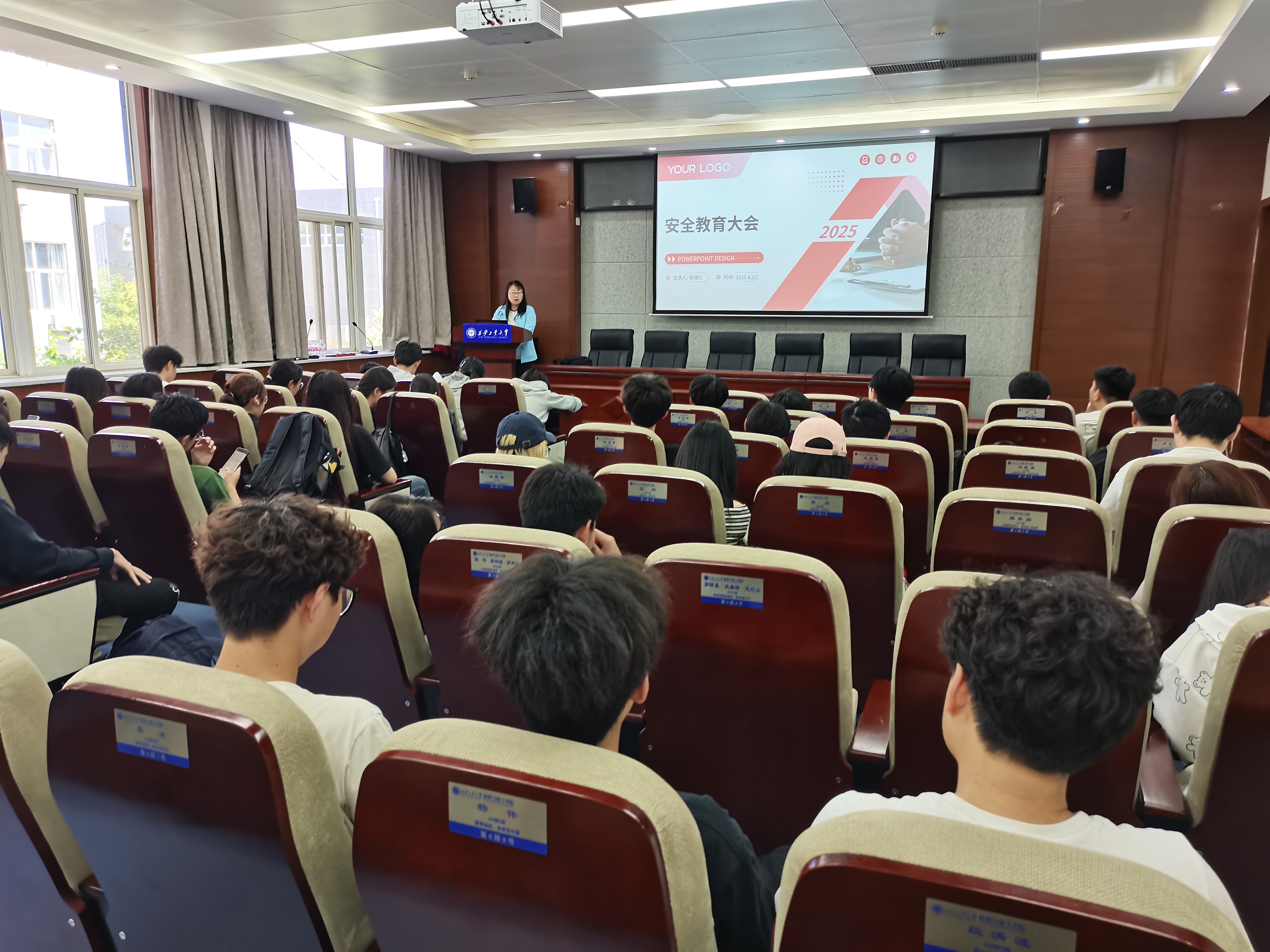 为做好2025年春季运动会、劳动节期间学生安全稳定工作,2025年4月23日中午,材化学院2022级在工4-204召开运动会暨劳动节安全教育大会。会议由辅导员张瑞红主持,2022级100余名学生参会。