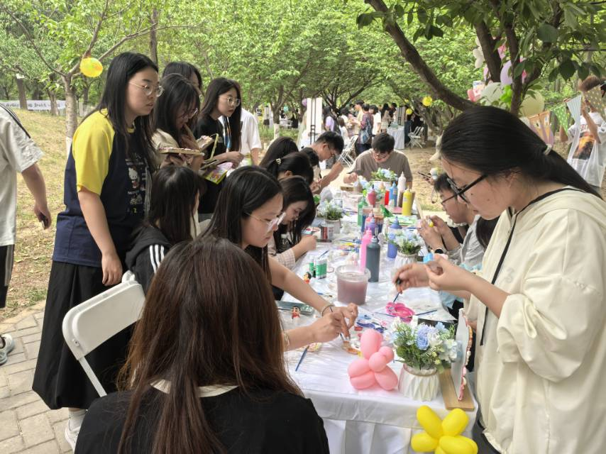 所在区域人声鼎沸,热闹非凡。同学们手持画笔,挑选自己喜欢的石膏娃娃,细心勾勒,将一个个纯白的石膏娃娃变成了色彩斑斓、充满个性的艺术品,每一笔都透露出创作者的独特情感与创意。一张张彩纸在同学们的巧手下幻化成形态各异的纸艺作品,展现了折纸艺术的无限魅力与可能。长条气球编造更是充满了无限创意,同学们用灵动的双手编织出一个个可爱的气球造型,欢声笑语充满了整个场地。本次活动还迎来了多位外国友人的热情参与。他们与同学们一同沉浸在手工创作的乐趣中,不仅促进了中外文化的交流与融合,也让活动现场更加多元与包容。