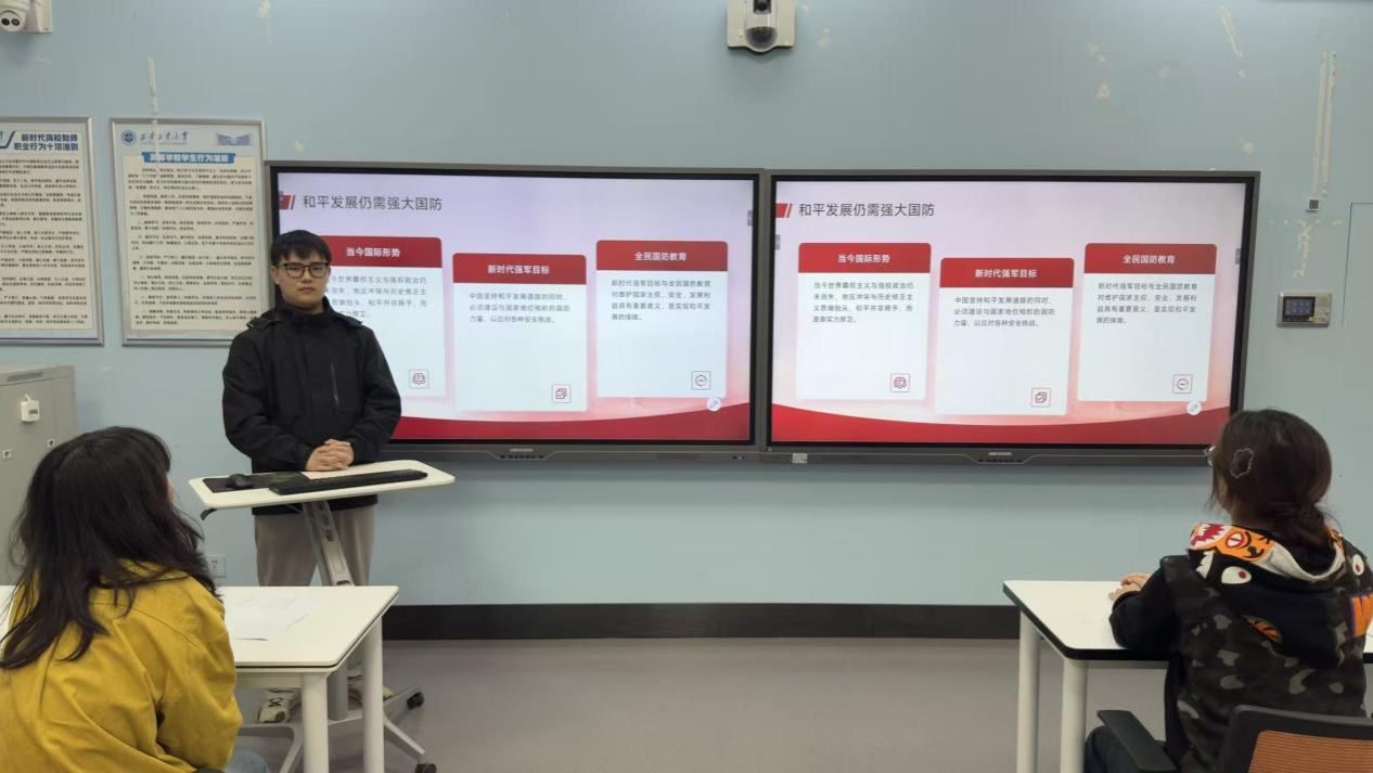 会议伊始,学生干部高淼阳以“历史脉络+核心逻辑”双轨模式展开讲解。他先通过时间轴清晰梳理了九一八事变的起因、经过及对中国近代史的深远影响,结合历史图片、文献节选等史料,还原了1931年东北沦陷的屈辱历程;随后深入剖析“民族觉醒”的核心内涵,指出事变不仅是国难开端,更唤醒了全民族的抗争意识,为后续全民族抗战奠定了思想基础。清晰的讲解让在场成员快速建立起对主题的系统性认知,也激发了大家探究历史细节、感悟精神内涵的兴趣。