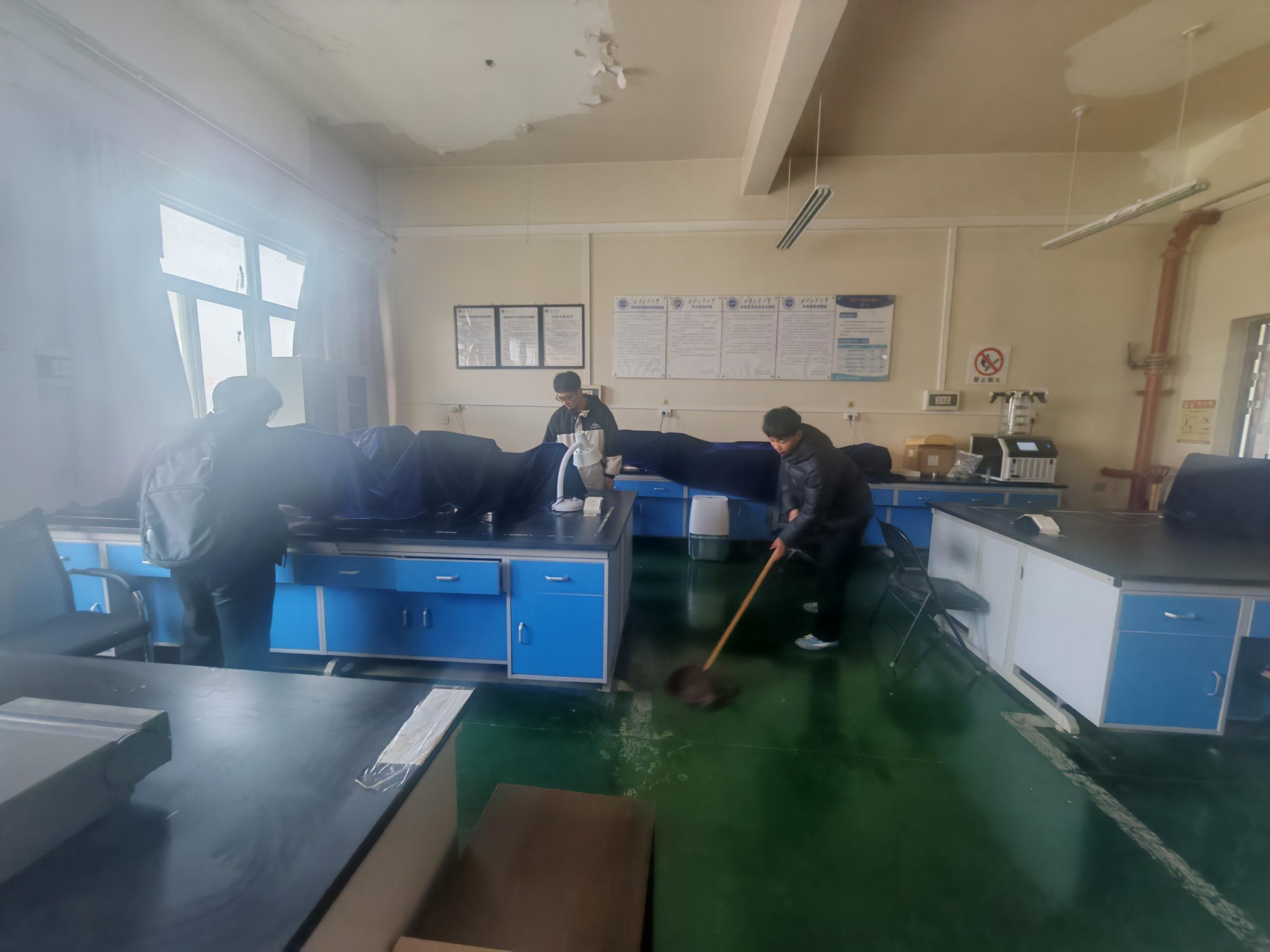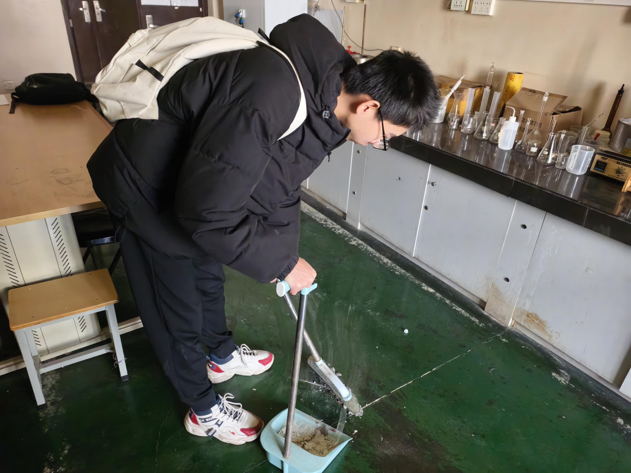 动员结束后,70余名学生迅速分组,有序前往学院多个教学与科研实验室开展清洁工作。活动现场,同学们仔细擦拭实验室台面,认真清扫地面污垢,分工明确、干劲十足,在同学们的共同努力下,一间间实验室变得窗明几净、整洁有序,为师生们营造了一个更加舒心、安全的科研教学环境。